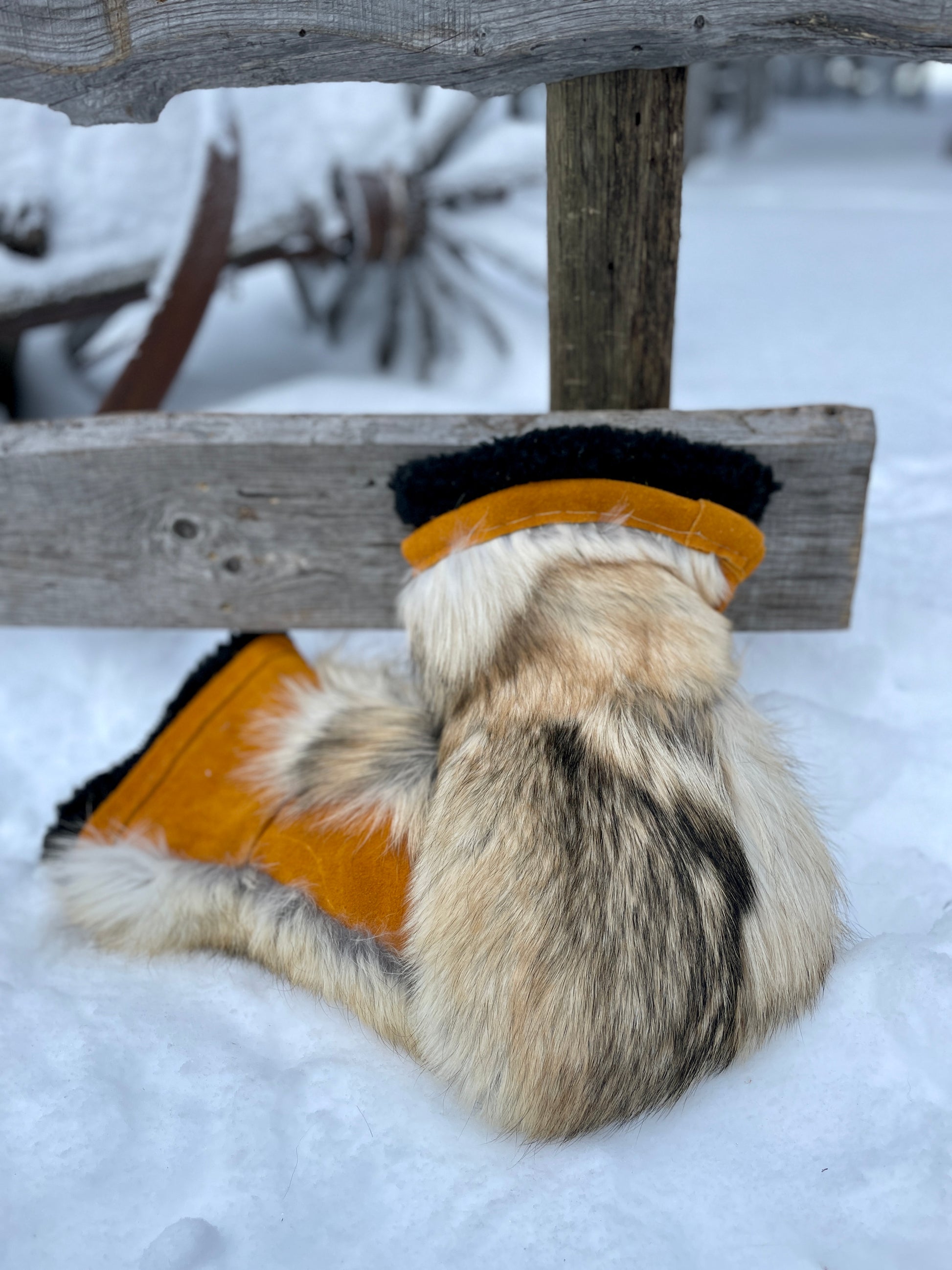 Classic style mitts made from grey wolf and moose hide for the palms and trim, lined with a thick faux shearling liner that is removable and washable.